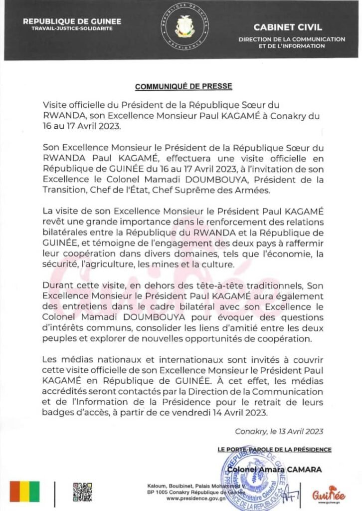 Le président de la République du Rwanda, Paul Kagamé effectuera à Conakry, une viste qui s’inscrit dans le cadre de renforcement des relations bilatérales entre la Guinée et le Rwanda. Du 16 au 17 avril 2023 donc, des qustions entre autres, d’intérêts commun, consolider les liens d’amitié entre les deux peuples, seront au cœur des échanges.