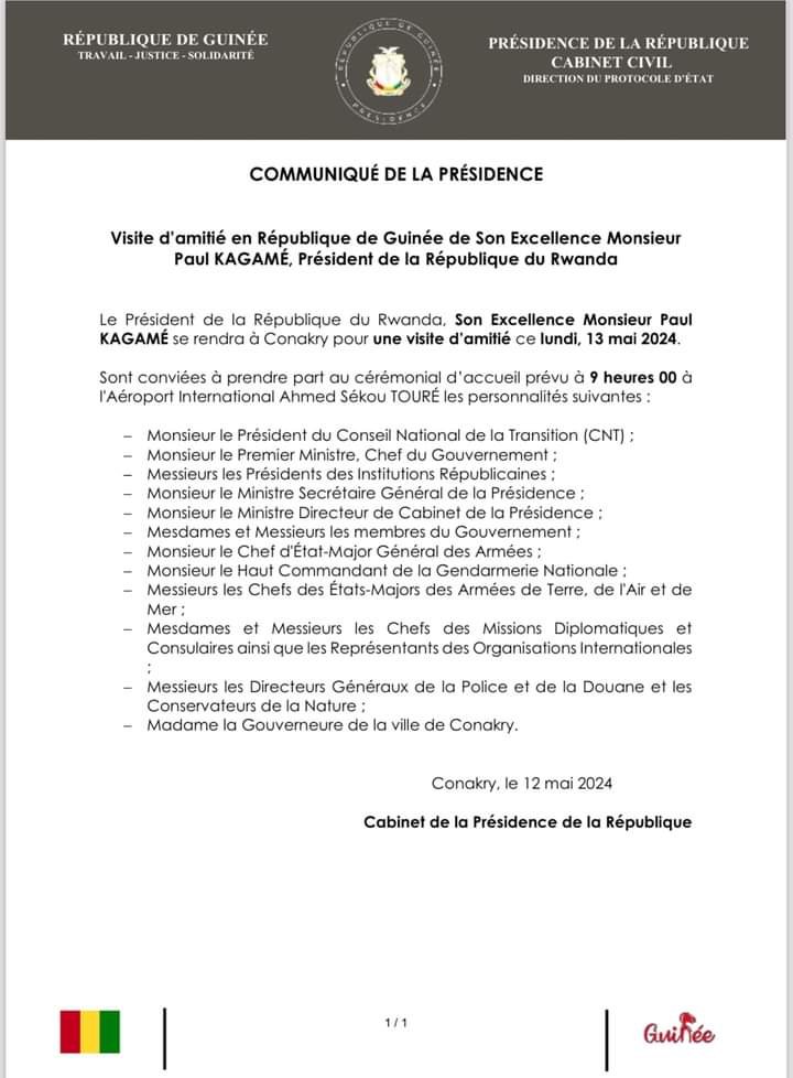 Le président Rwandais, Paul Kagamé, est attendu, à Conakry, ce lundi 13avril 2024. C’est une viste d’amitié qu’il effectuera à son homologue, Général Mamadi Doumbouya.