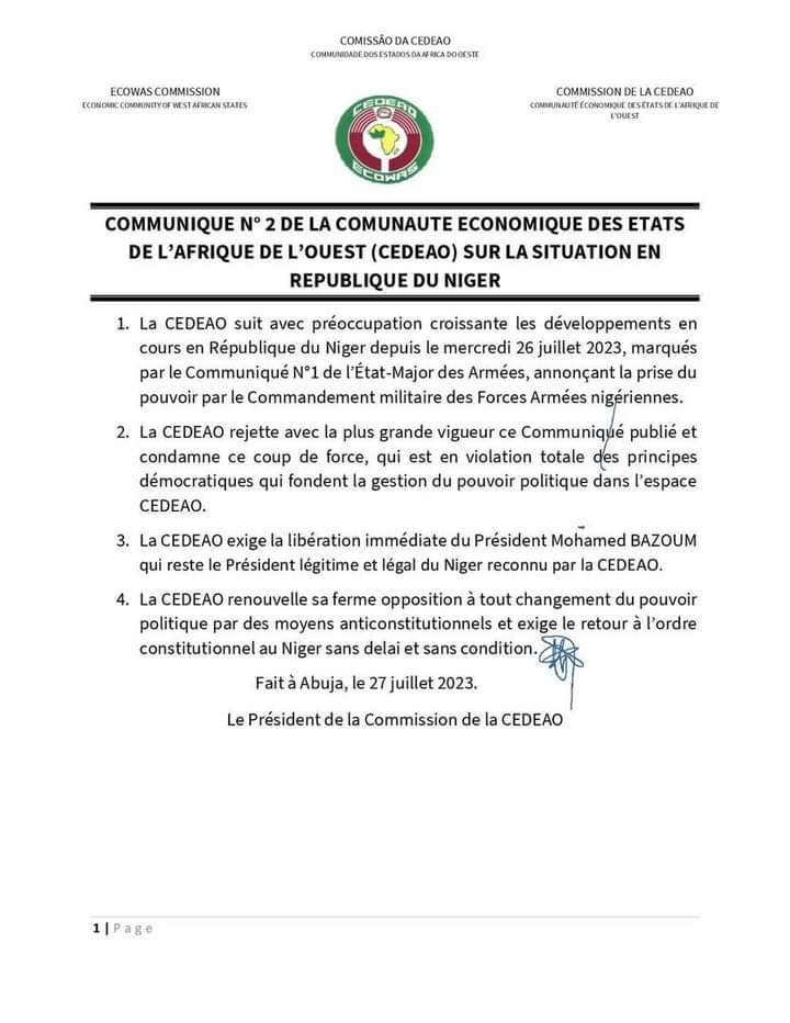 Ci-dessous le deuxième communiqué de la CEDEAO.