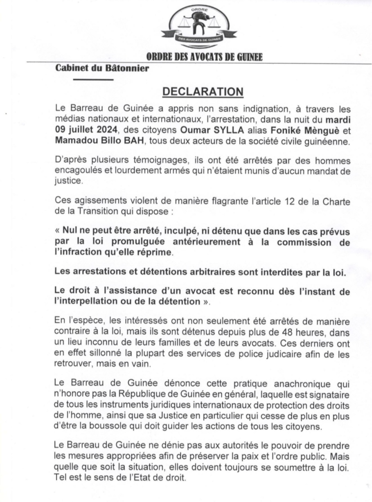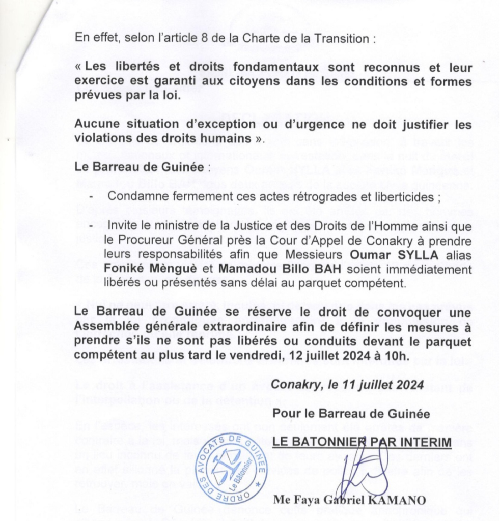 Suite à l’arrestation des deux acteurs du front national pour la défense de la constitution (FNDC), le barreau de Guinée hausse le ton. Dans une déclaration rendue publique, ce jeudi 11 juillet 2024, le beau de Guinée a ferment condamné ces actes qu’il qualifie « rétrogrades et liberticides ».
