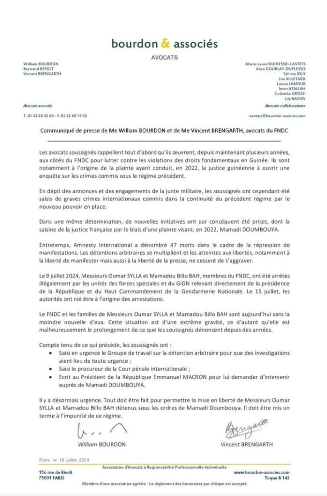 • Disparition des leaders du FNDC: la CPI saisit par un cabinet d’avocat français (communiqué)