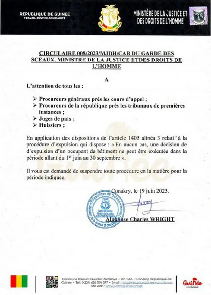 Dans une lettre rendue publique ce 19juin 2023, le garde des Sceaux, ministre de la Justice et des Droits de l’Homme, Alphonse Charles Wright a rappelé, 《en aucun cas une décision d’un occupant de bâtiment ne peut-être exécuté dans la période allant du 1er juin au 30 septembre》. Et, il interpelle les procureurs généraux près de la cour d’appel, procureurs de la république près les tribunaux de première instance, les juges de paix et huissiers sur les dispositions de l’article 1405 alinéa 3 relatif à la procédure d’expulsion.