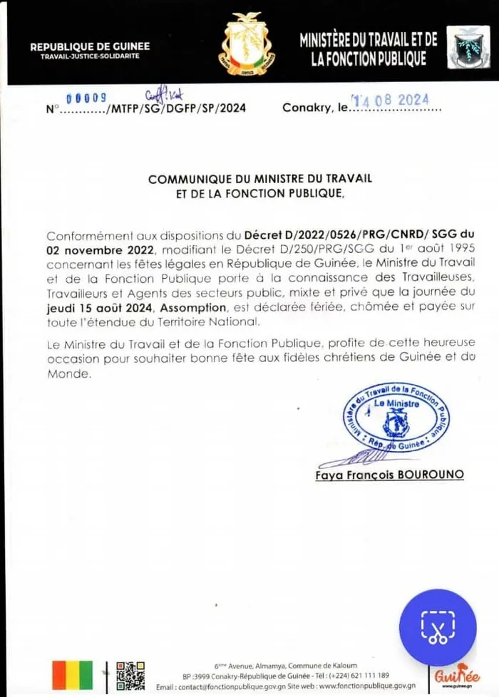 Le jeudi, 15 aout 2024, est déclaré férié, chômé et payé, sur toute létendue du territoire guinéenne. C’est ce qu’indique un communiqué du ministre du Travail et de la Fonction Publique portant «connaissance des travailleuses, travailleurs et agent des secteurs public, mixte et privé que la journée du jeudi 15 aout 2024, assomption, est déclarée fériée, chômée et payée sur toute l’étendue du territoire nationale.»