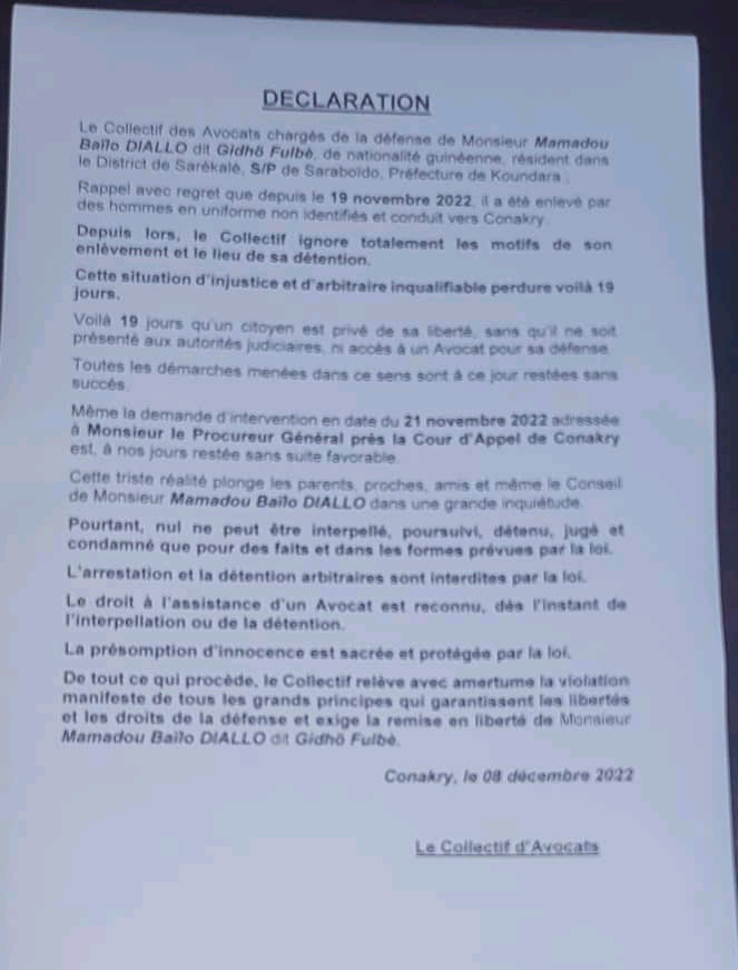 C’est le 19 novembre dernier à Saré Boydho dans la préfecture de Koundara, Mamadou Baïllo Diallo dit Guidho Fulbhé, a été arrêté par des hommes en uniforme.