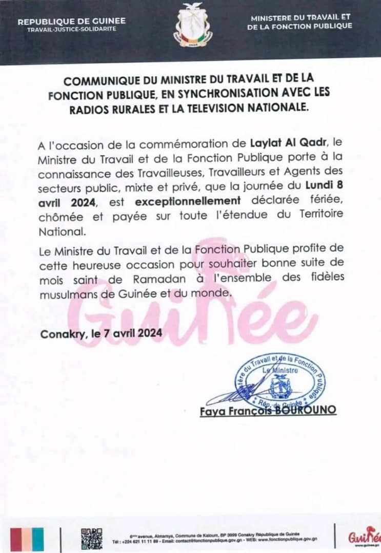 La journée du lundi 8avril 2024, a été déclarée fériée, chômée et payée sur toute l’étendue du territoire national en Guinée. Cette décision du ministère du travail et de la fonction publique de Guinée, fait suite de la commémoration de la Laylat Al Gadr (la nuit du destin) du mois saint de ramadan.