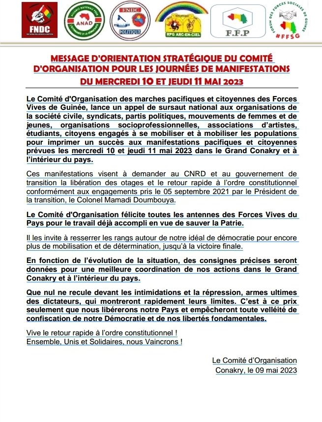 Les Forces Vives de Guinée (FVG) maintient pour le moment, ses manifestations des journées du 10 et 11 mai 2023, à Conakry. Le comité d’organisation pour ces journées de manifestations du mercredi et jeudi, lance un message d’orientation stratégique.