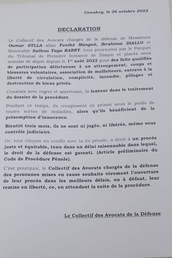 Le collectif des avocats du Coordinateur du front national pour la défense de la constitution (FNDC) Oumar Sylla dit Foniké Manguè, Ibrahima Diallo, aussi responsable du front et ainsi que le secrétaire exécutif de l’union des forces démocratiques (UFR) croupissent en prison depuis près de trois mois. Ne bénéficiant toujours pas de procès, le collectif des avocats 《constate avec regret et amertume》 dans le traitement du dossier de la procédure.