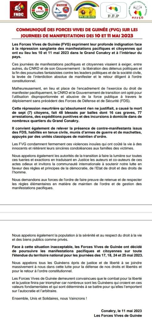 Dans le bilan des deux journées de manifestations du 10 et 11mai 2023, les Forces Vives de Guinée (FVG) dressent un bilan très lourd. Ces journées ont causé selon le communiqué, 7 morts, 48 blessés par balles et 16 cas graves, 77 arrestations.
