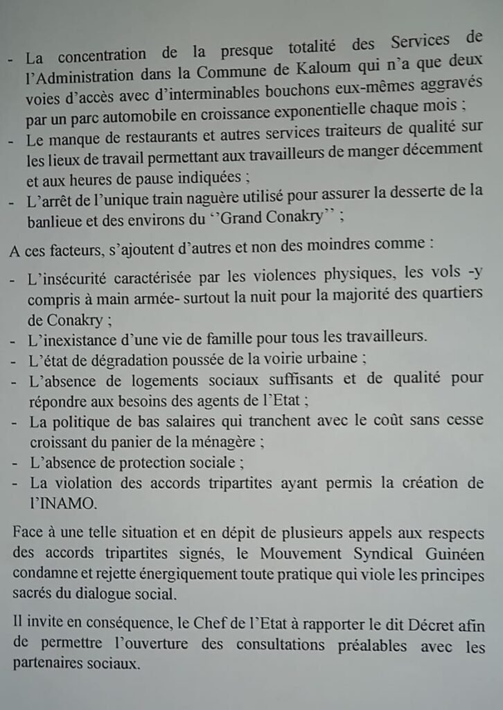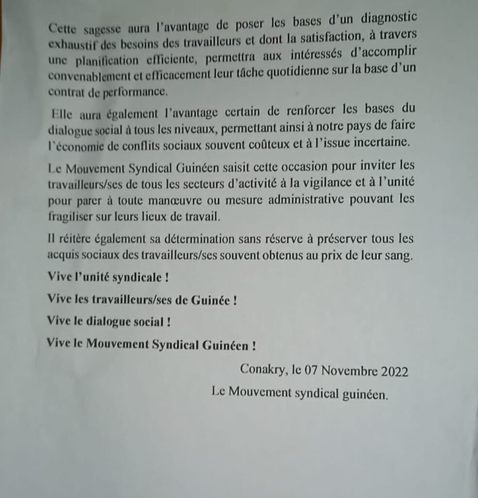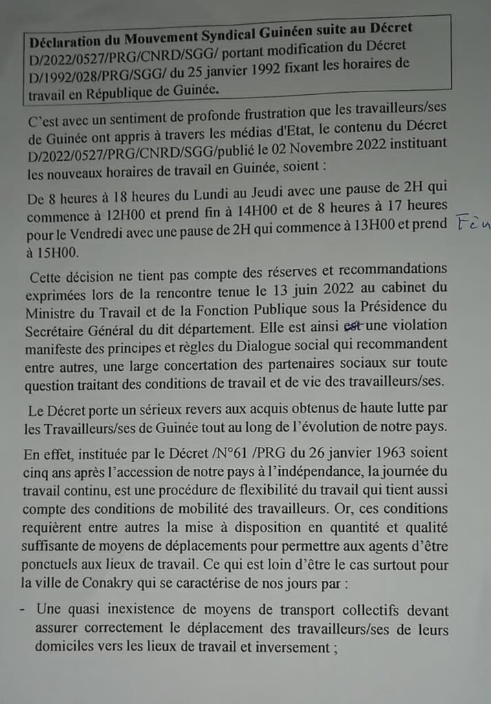 Le décret modifiant les horaires en Guinée continue à défaire la chronique. Ce lundi 07novembre 2022, le mouvement syndical guinéen dans une déclaration a condamné et rejeté ledit décret. Ci-dessous la déclaration.